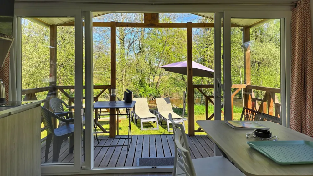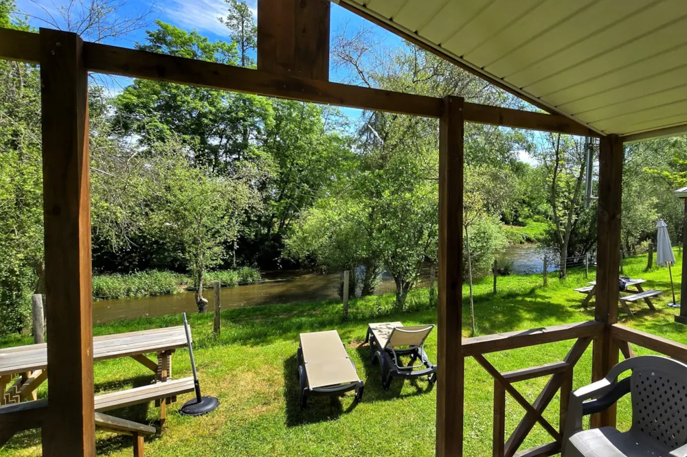 Das Mobilheim empfängt Sie am Flussufer in ruhiger Lage, wo das Rauschen des Wassers Ihre Momente der Entspannung begleitet.