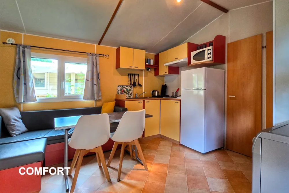 Unsere Komfort-Mobilheime sind ideal für große Familien mit sechs Personen und bieten einen einladenden Ort für unvergessliche Erinnerungen. Ausgestattet mit drei Schlafzimmern, eines mit einem Doppelbett (140 x 200) und zwei mit zwei Einzelbetten (80 x 190), Klimaanlage oder Geschirrspüler (je nach Modell), Fernseher, Kühlschrank, Geschirr, Mikrowelle, Kochplatte, Duschbad und separatem WC, werden Sie sich während Ihres Aufenthalts wie zu Hause fühlen.