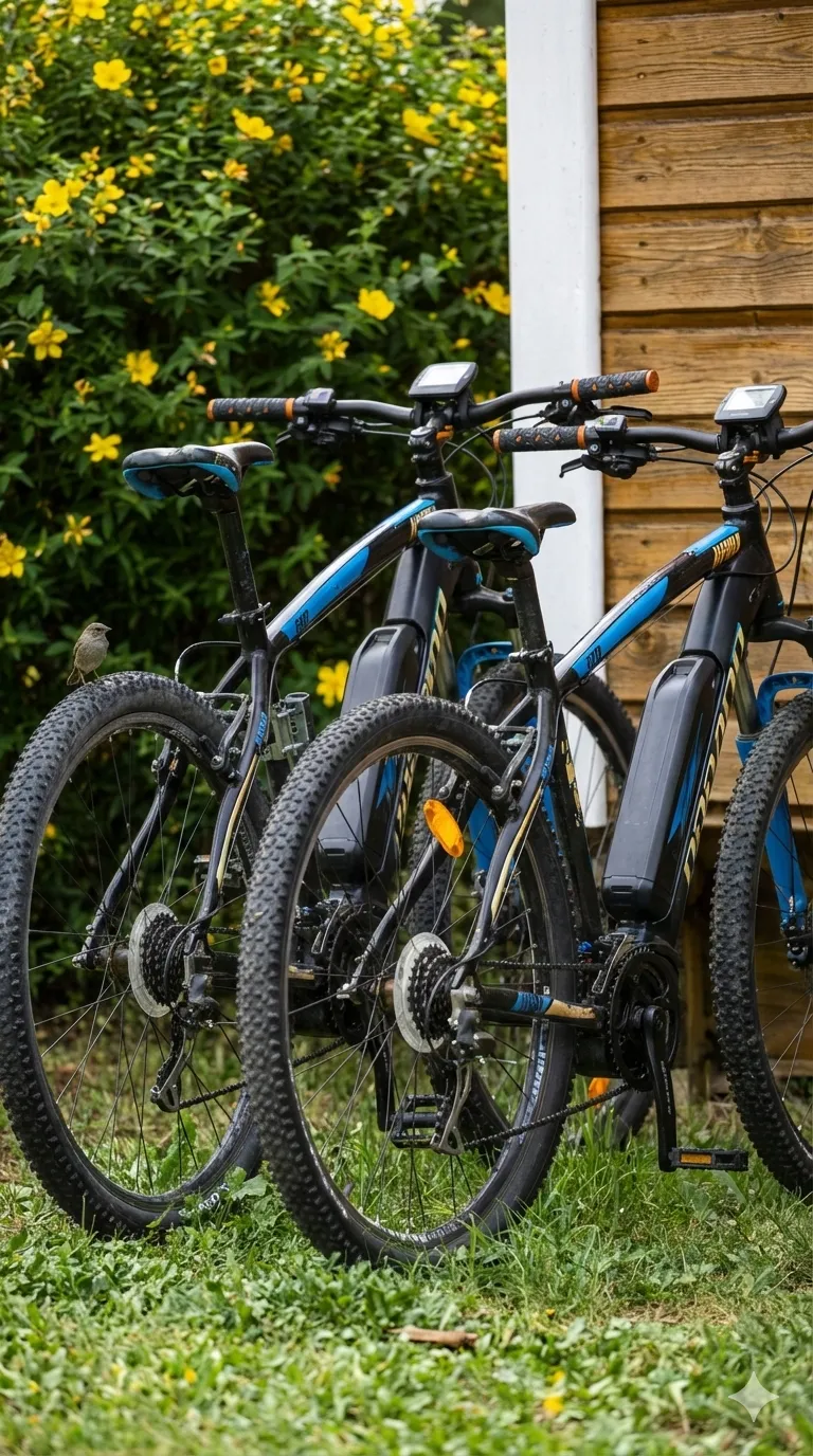 2 adult bikes, size M, with electric assistance, 600 Wh battery, up to 70 km range, stand and lock, practical guides, helmets, and repair kit.