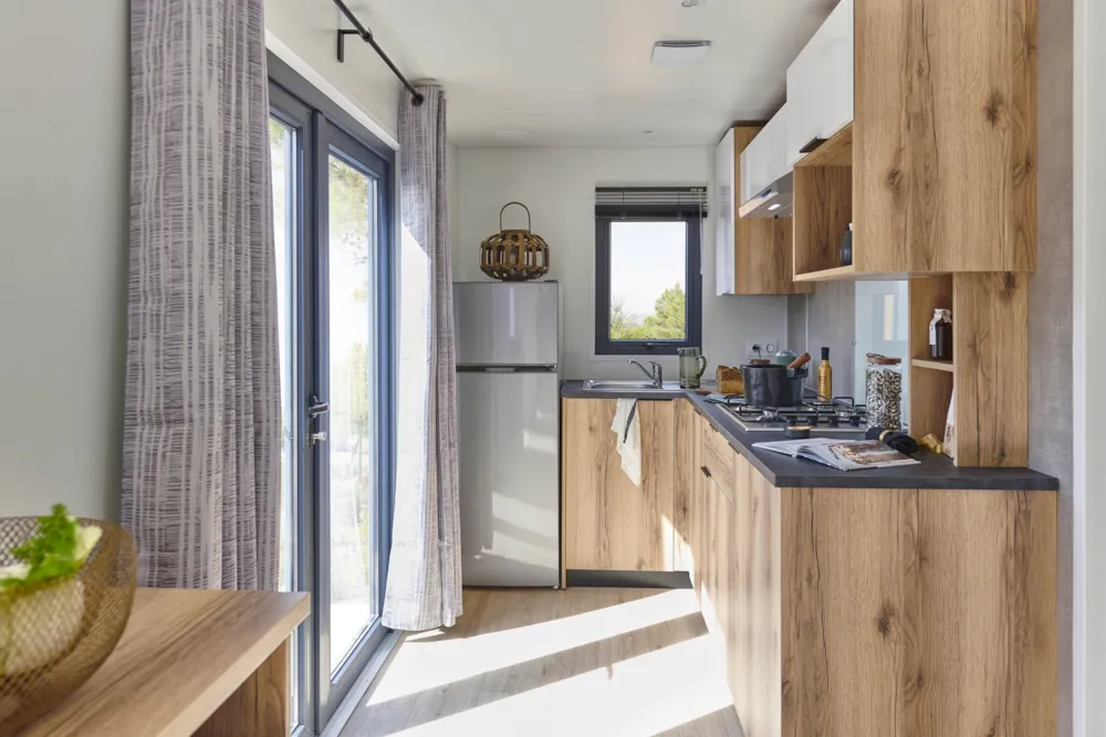 Vivez de merveilleuses vacances en famille en réservant le Mobil-Home Confort Murier 2ch, une location taillée pour les vacances « nature et confort » près de Vallon Pont d’Arc en Ardèche. Parfait pour un séjour en toute simplicité où il fait bon renouer avec la nature et apprécier les plaisirs simples qu'offre l'Ardèche méridionale ! Superficie totale : 26,80 m² Animaux non acceptés Chambres séparées : 2 Le Cottage Confort Murier comprend : 1 chambre avec un lit pour 2 personnes (140 x 200) 1 chambre avec deux lits 1 personne 1 séjour avec canapé 1 cuisine équipée avec frigo, 4 feux gaz, micro-onde et cafetière électrique 1 salle de bains avec grande douche, lavabo WC séparés 1 terrasse en bois couverte avec salon de jardin